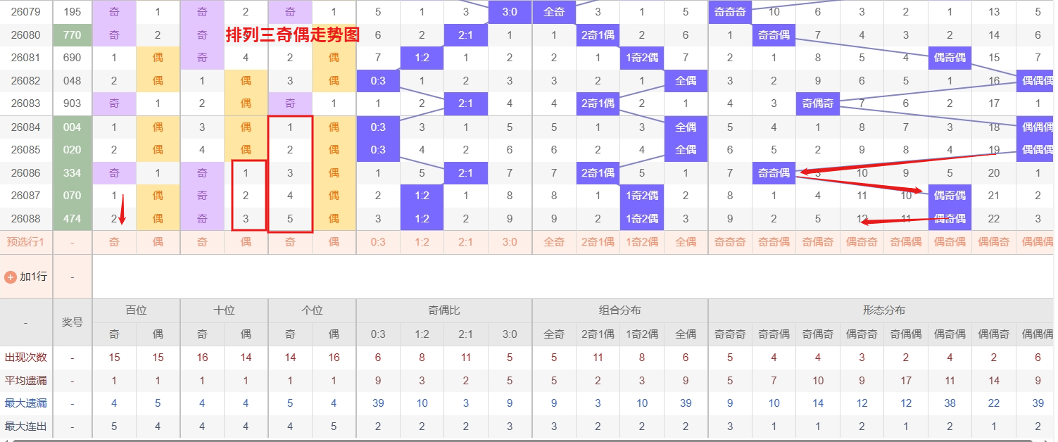 排列三 奇偶分析:从上图可以看出排列三100期内百位奇偶比约为54比46,十位奇偶比为51比49,个位奇偶比为52比48,十位的比值比较均衡,但是百位的比值偏差就有点大,历史奇偶形态近2期开出偶奇偶后下一期的走势为,第004期开出偶奇偶后005期开奇偶奇, 第014期开出偶奇偶后第015期开偶奇奇,第032期开出偶奇偶后第033期开偶偶奇,近期排列三奇偶走势来看,偶奇奇组合作为温号,近期出现频率稳步提升,已展现出明显的转热迹象,尤其在奇偶分布图中呈现出间歇性密集的特征,往往在奇奇偶或奇偶偶等相邻形态切换后顺势走出,具备较好的衔接能力,值得持续跟踪。与此同时,偶偶奇组合则处于明显的冷态,遗漏期数远超其历史平均出现周期,属于当前奇偶形态中较长时间未出的冰点。所以排列三2026089期奇偶形态推偶奇奇与偶偶奇。本文由一起彩钱是生命动力所著,请勿转载