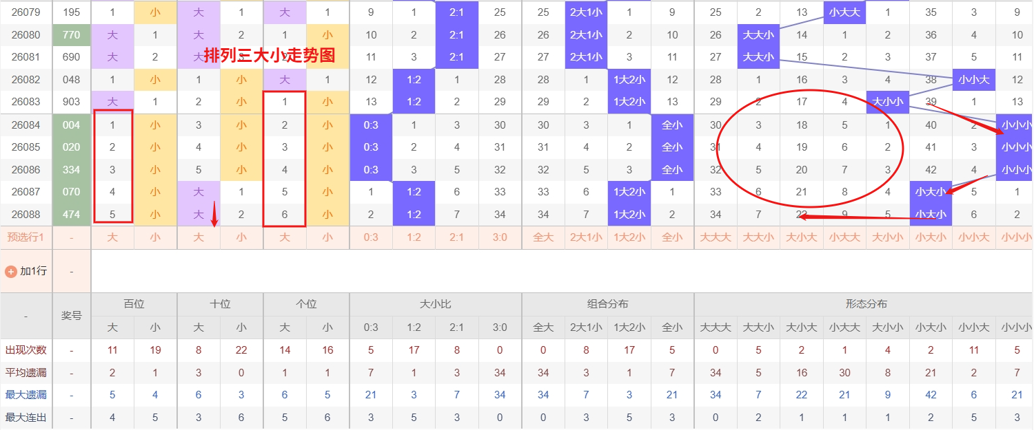 排列三 大小形态分析:从大小走势图上可以看出排列三100期内百位大小比约为55比45,十位大小比约为47:53,个位大小比约为52比48,除了个位和百位奇数比偶数多,十位偶数比奇数多。历史数据近2期开出小大小下一期的走势为,第002期开小大小后第003期开大大大。第017期开出小大小后第018期开大小大,第031期开出小大小后032期开小大大。近期排列三大小走势来看,小大大与大大大这两种形态均已进入明显的冷号区间,遗漏期数远超各自的历史平均出现周期,处于深度未出的冰点状态。从大小形态的轮动与平衡规律分析,当两组大数占优的形态同时处于深冷状态时,往往意味着大数区域的整体回补需求正在累积。尤其是小大大作为一大两小向两大一小过渡的中间形态,以及大大大作为全大组合的极端代表,两者在冷态共振后,一旦大小走势出现由小转大的松动信号,这两种冷形态的反弹概率将显著提升。所以排列三第2026089期大小形态推荐小大大大大大本文由一起彩钱是生命动力所著,请勿转载