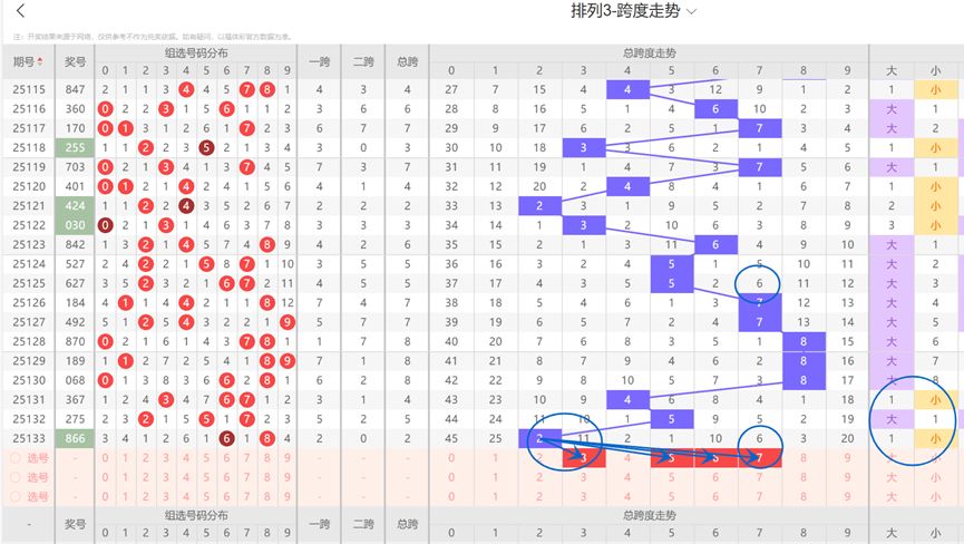 通过观察跨度及跨度属性走势可以发现:近10期内跨度小数号码出号数量少于大数号码,可见近期跨度更容易开出大数号码,上期跨度开出了小数号码2,本期跨度大数号码出号可能性高于小数号码,因此本期跨度应该主要考虑大数号码出号;再结合上述走势图看,本期跨度看好567,防邻号3等号码。