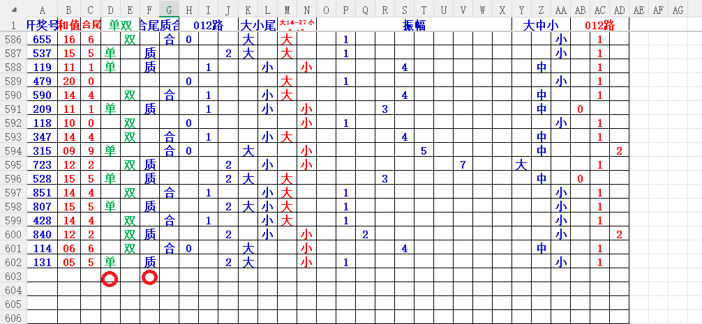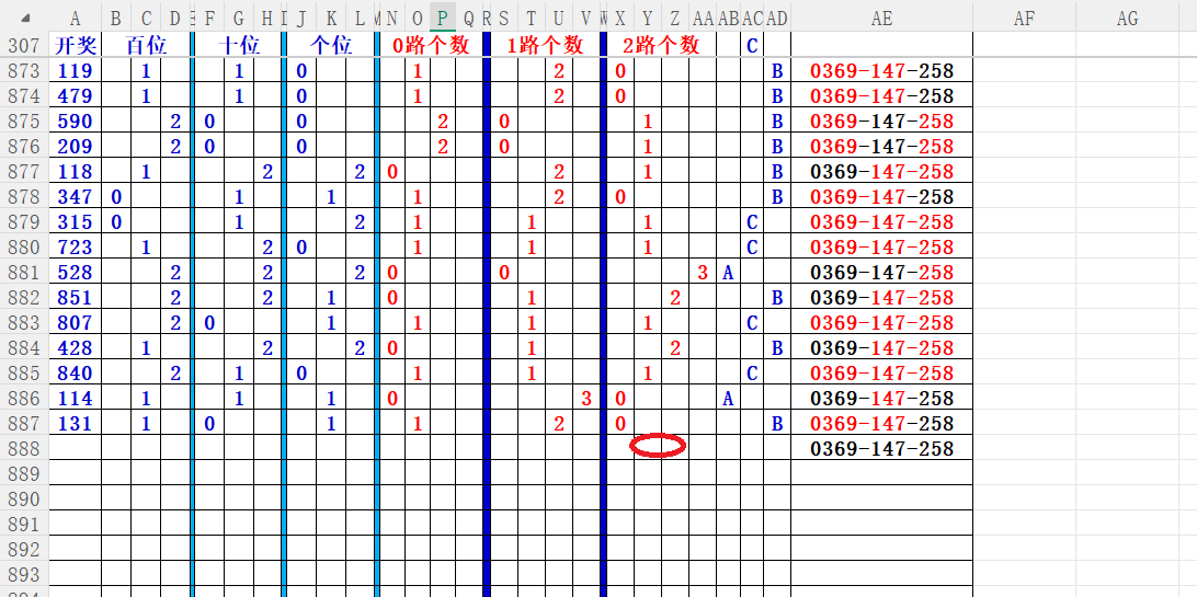 如上图56,012路分析0路出号的概率还是很大,本期可以从0路号入手做胆0369中选;看好369胆码。