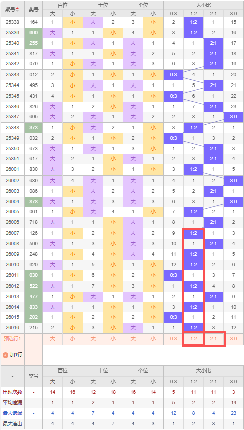 上期大小比:1:2,近10期大小比出现情况:1:2、2:1、1:2、1:2、0:3、1:2、2:1、1:2、0:3、1:2,最近10期出2期2:1,出现6期1:2,出现2期0:3,出现0期3:0,根据近10期出号规律本期推荐连出1:2,防遗漏3期出2:1,综上所述大小比推荐:防:2:1,重点关注:1:2。