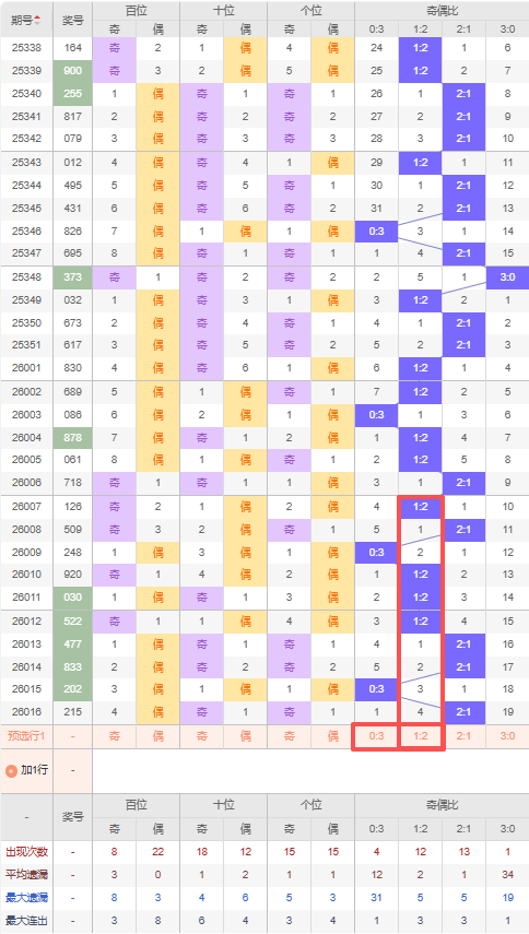 上期质合比:3:0,近10期质合比出现情况:2:1、1:2、1:2、1:2、1:2、3:0、2:1、2:1、2:1、3:0,最近10期出现4期2:1,出现4期1:2,出现0期0:3,出现2期3:0,根据近10期规律本期推荐遗漏5期的1:2,防隔期出2:1,综上所述质合比推荐:防:2:1,重点关注:1:2。