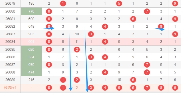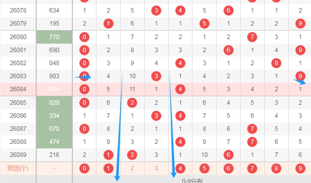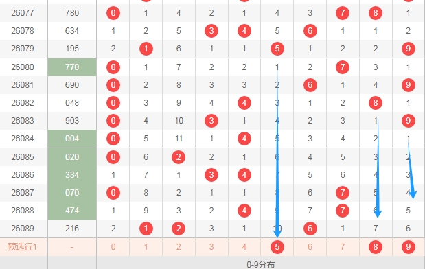 上图是体彩排列三开奖号码走势分布图,我标注出来的数字都是遗漏周期大的数字,看上面走势图中标注出来的蓝色箭头,分别是数字589,本期可以留意这三个数字出一个或者两个。