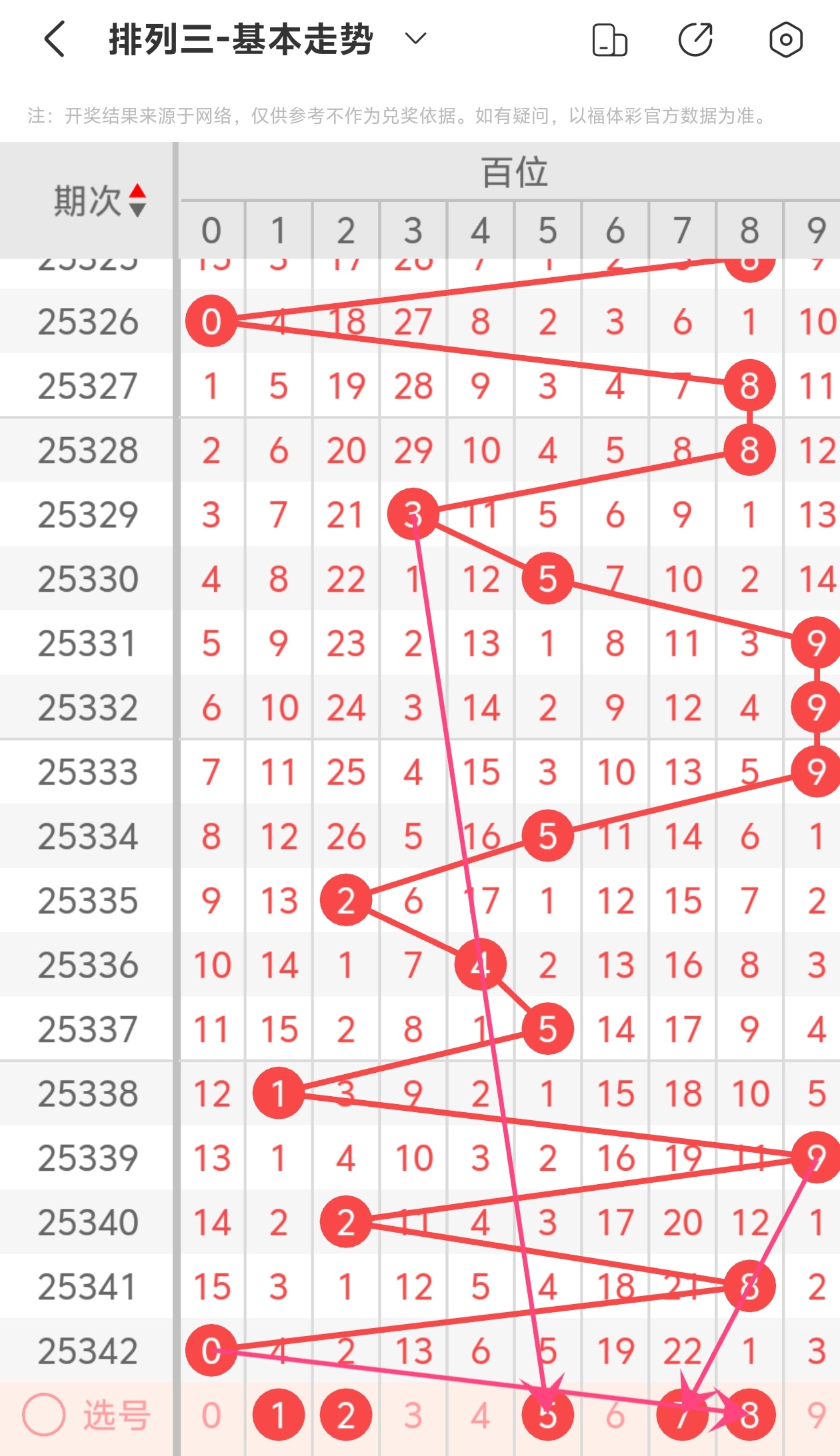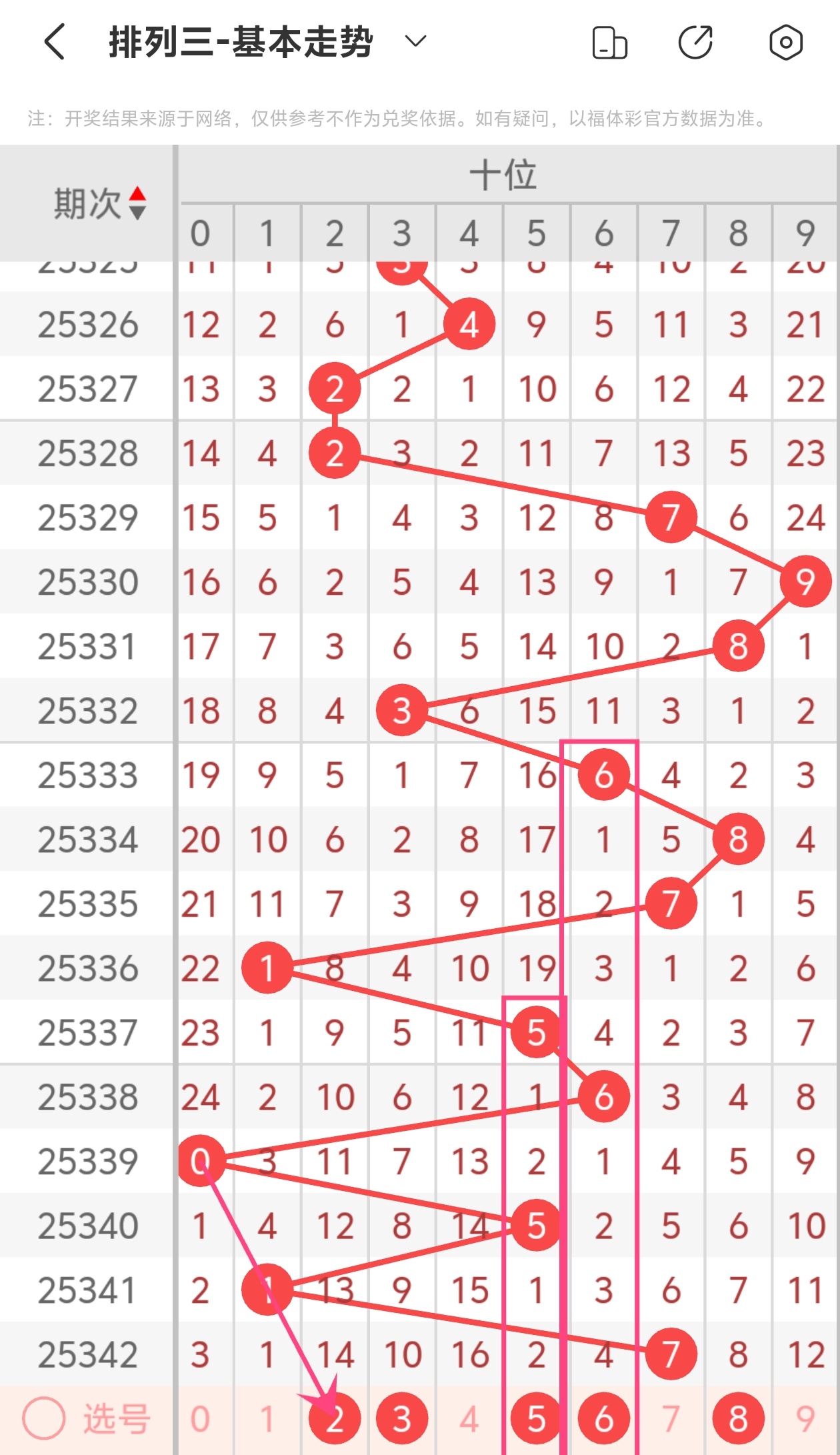 上期十位开出7,本区与上期的跨度为6,本期我们可以从上面走势图中看出选号的思路,2为斜连走势跨度为五,5为对称形态走势跨度为二,6为对称形态,8为分边走势跨一,综合以上分析,本期十位推荐:23568