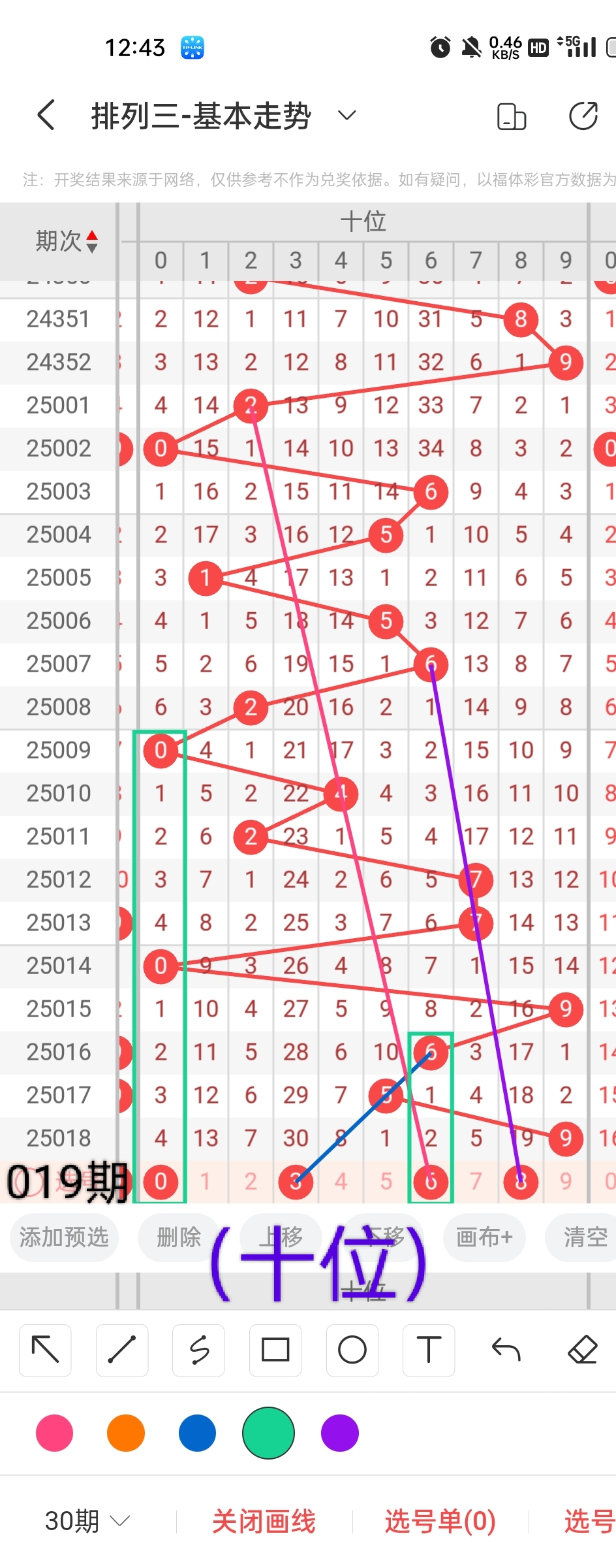 我们根据图中画线的思路可以看出,遗落16期未出的冷码0与前几期开出的号码呈斜三连的走势,跨度为2;遗落28期未出的大冷码4与前几期开出的号码呈两条斜三连的走位,跨度为2;号码6与前几期开出的号码呈斜三连的走势且呈隔期回补走位,跨度为4;遗落34期未出的特大冷码9与前几期开出的号码呈斜三连的走势格局,跨度为7。综上所述,小梁预测个位开出的号码为0、4、6、9。
