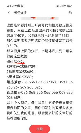 上图是上期体彩排列三号码分析文章截图,我最后推荐的胆码正确,这个你们去看上期的文章吧。