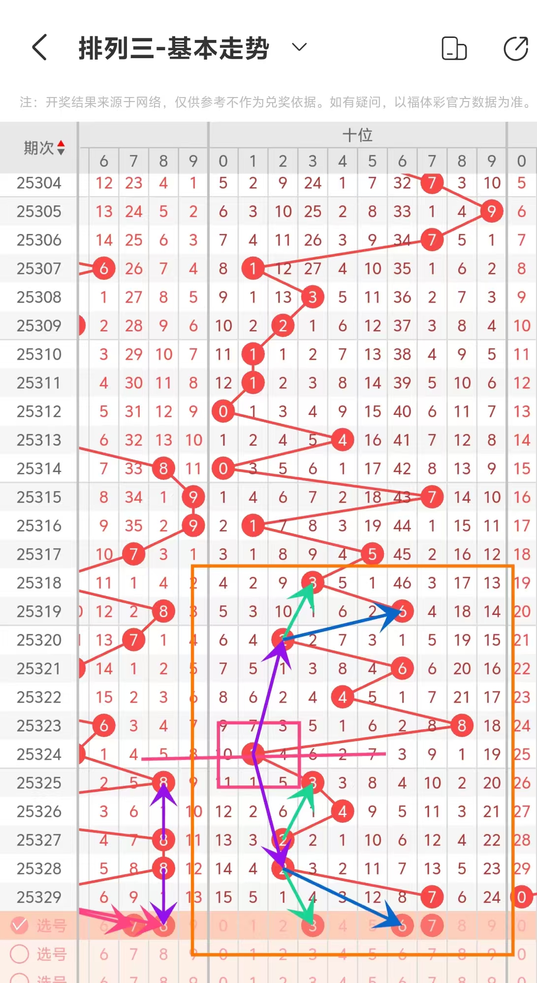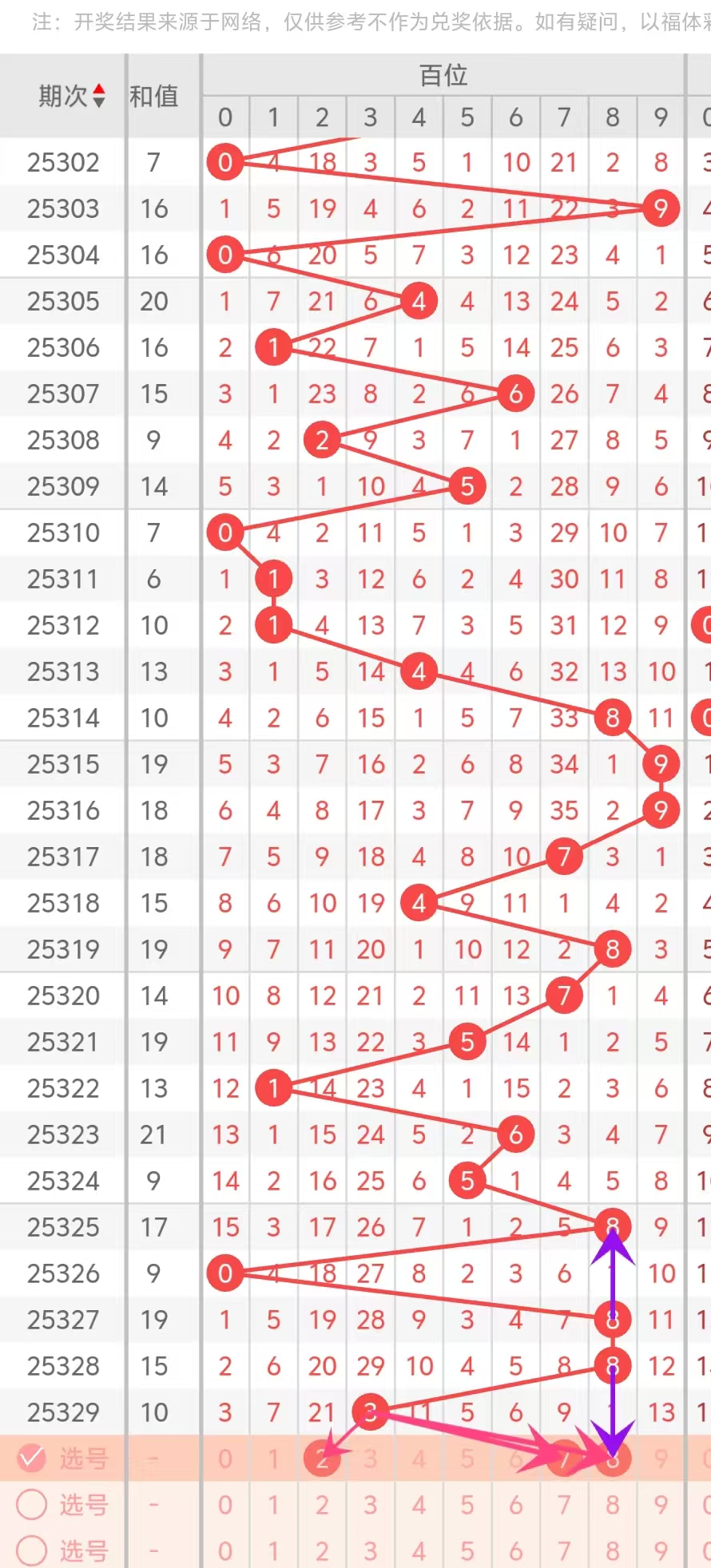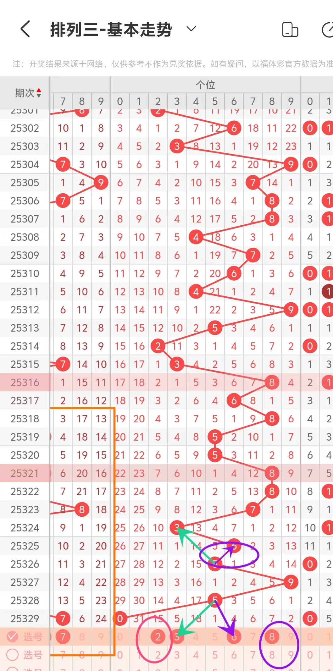 个位里,我们先防一手冷热号,冷号是2,15期没来,热号是8,30期里来了6次,最多的热号,所以个位先选择2,8,看上图紫色圆圈里的5绿色箭头斜空上连着3,斜连着6,按规律来就是斜空下连着3,紫色箭头斜空下连着6,防一手6