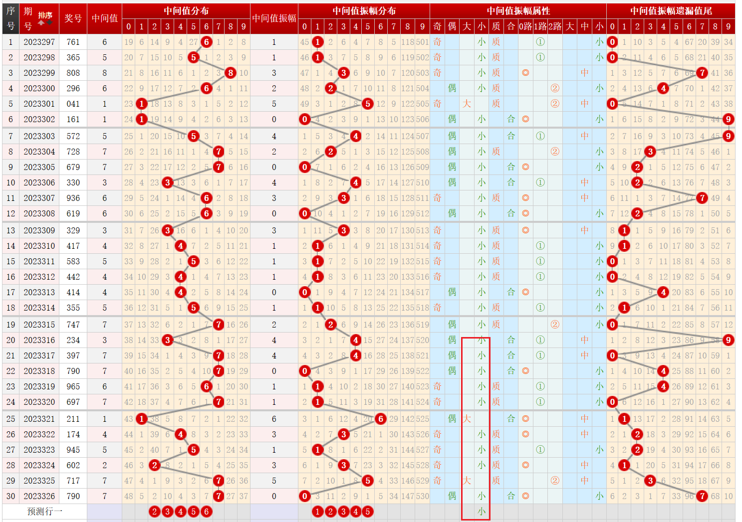 从中间值振幅大小属性来看,近10期内小数容易连开,上期开出了小数,则本期应该仍会开出小数;从质合属性来看,近10期内质数出号6期、合数开出4期,质数出号机率高于合数;故本期中间值振幅应该为小数、质数号码;符合条件有1-2-3,防4-5。通过中间值振幅计算,本期中间值可能为2-3-4-5-6。