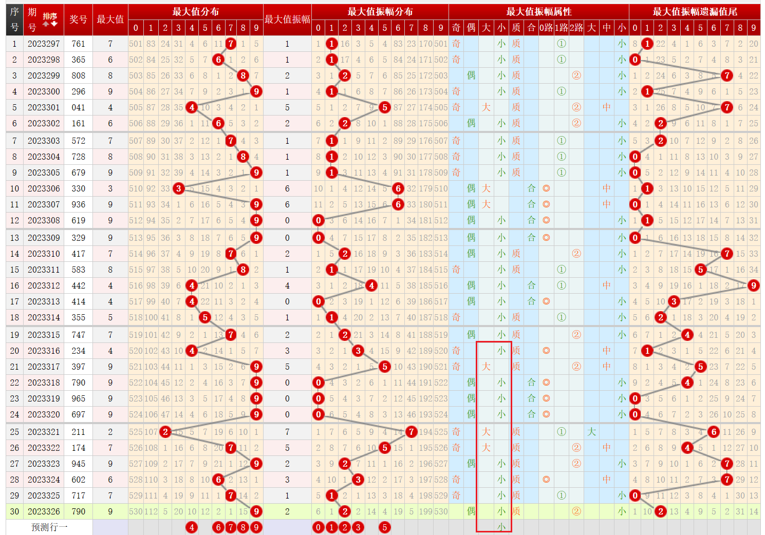 上一期最大值开出号码为9,为奇数、大数、合数、0路号码。通过观察上图最大值振幅属性走势: