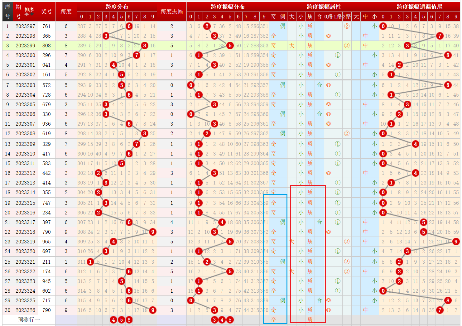 从跨度振幅质合属性来看,近10期内质数出号8期,合数仅开出2期,可见质数号码出号机率高于合数;从奇偶属性来看,近10期内奇数出号数量多于偶数,可见奇数号码更容易出号;故本期跨度振幅应该为奇数、质数号码。符合条件的为3-5,防4;通过跨度振幅计算,本期跨度可能为4-5-6。