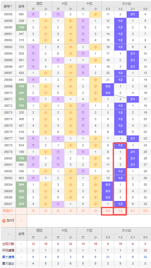 上期大小比:1:2,近10期大小比出现情况:2:1、1:2、2:1、2:1、2:1、1:2、1:2、0:3、0:3、0:3、1:2,最近10期出3期2:1,出现4期1:2,出现3期0:3,出现0期3:0,根据近10期出号规律本期推荐连出1:2,防隔期出0:3,综上所述大小比推荐:0:3,重点关注:1:2。