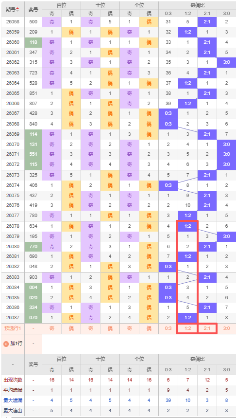 上期奇偶比:1:2,近10期奇偶比出现情况:1:2、3:0、2:1、1:2、0:3、2:1、0:3、0:3、2:1、1:2,最近10期出现3期2:1,出现3期1:2,出现3期0:3,出现1期3:0,根据近10期出号规律本期推荐隔期出2:1,防连出1:2,综上所述奇偶比推荐:1:2,重点关注:2:1。