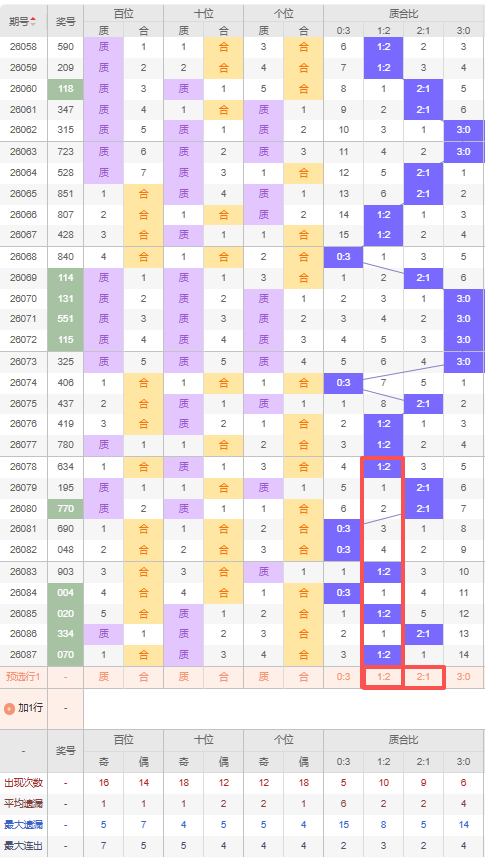 上期质合比:1:2,近10期质合比出现情况:1:2、2:1、2:1、0:3、0:3、1:2、0:3、1:2、2:1、1:2,最近10期出现3期2:1,出现4期1:2,出现3期0:3,出现0期3:0,根据近10期规律本期推荐隔期的2:1,防连出1:2,综上所述质合比推荐:1:2,重点关注:2:1。