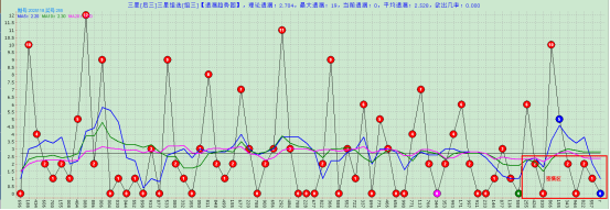 上图是组三的遗漏图,图中可以看到目前的遗漏值是0,5线已经下穿长期均线形成了死叉,落点看0-2这个周期还是开出频率比较高的区间,这个区间内还是继续看组三的反弹行情。