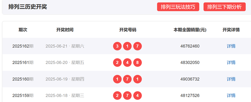 体彩排列3上一期,开奖号码为317,形态为组六 ,奇偶比为3:0,012路数值表现为011,和值11,和尾1,跨度6。