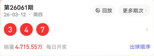 2026061期开奖号码为347,奇偶值为21偶;大小值为12小;012路走势为011路;跨度为4跨;和值14点;组六形态。