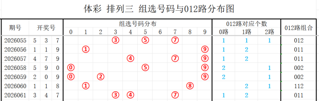 7期(055~061)开奖号与012路组合分别为537(012)、119(011)、479(011)、590(002)、209(002)、118(112)、347(011)上期开奖号为011路组合,根据整体走势分析,本期看好的012路组合有:001、002、012,022、112、122路组合。