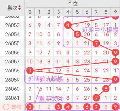 7期(055~061)开奖号个位号码球分别为7、9、9、0、9、8、7,开奖号与上一期走出的振幅分别为2、2、0、9、9、1、1。055期走出7号大数号码球,走出“2”的小幅度,056期走出9号大数号码球,走出“2”的小幅度,057期走出9号大数号码球,走出“0”的小幅度,058期走出0号小数号码球,走出“9”的大幅度,059期走出9号大数号码球,走出“9”的大幅度,060期走出8号大数号码球,走出“1”的小幅度,061期走出7号大数号码球,走出“1”的小幅度;从近期振幅大小的走势及大小走势来看,中大振幅走在4~7之间较为适宜,中小振幅走在0~3之间较为适宜;结合走势图的整体及大小走势分析,本期个位应重点关注号码球为0、3、4、6、7、9