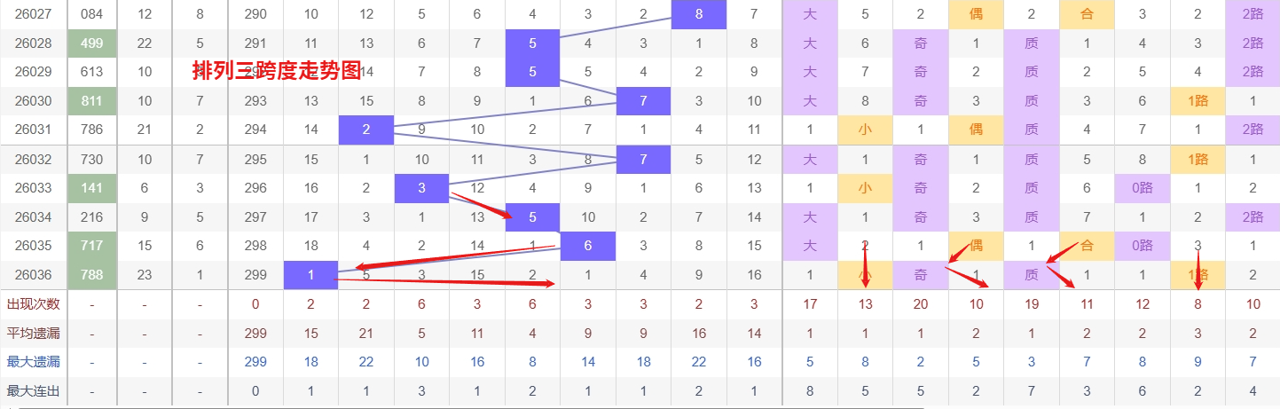 排列三 跨度分析:从上图可以看出近100期的跨度大小比约为49比51,跨度奇偶比约为48比52总体来看还是比较均衡的,但跨度大小之间有点差异。我们再从历史开出1跨后下一期5跨度数据来做参考。最近10期跨度大小比约为5:5期开出大数跨度过多返回小数跨度的概率更高一点。历史开奖近2期出1跨以后的走势为313期开出1跨后下一期走8跨走出7振幅,第337期开出1跨后下一期走5跨走4振幅第004期开出1跨后下一期开出6跨走出5振幅。连续多期大振幅排列三跨度走势观察,近期排列三跨度走势分析,5跨正处于明显的热态阶段,连续或高频出现使其成为当前关注的核心,热度惯性下短期内仍有持续走强的可能,应作为防守重点。而8跨已遗漏较长周期,逐渐累积的冷态使得其回补需求不断增强,从统计概率与走势平衡的角度看,冷跨往往在形成阶段性极点后出现反弹,出1跨度后容易走出1到5个跨度振幅的对称形态,跨度走出1到5个振幅看好的跨度有3578跨,所以第2026037期排列三跨度推荐3578跨。