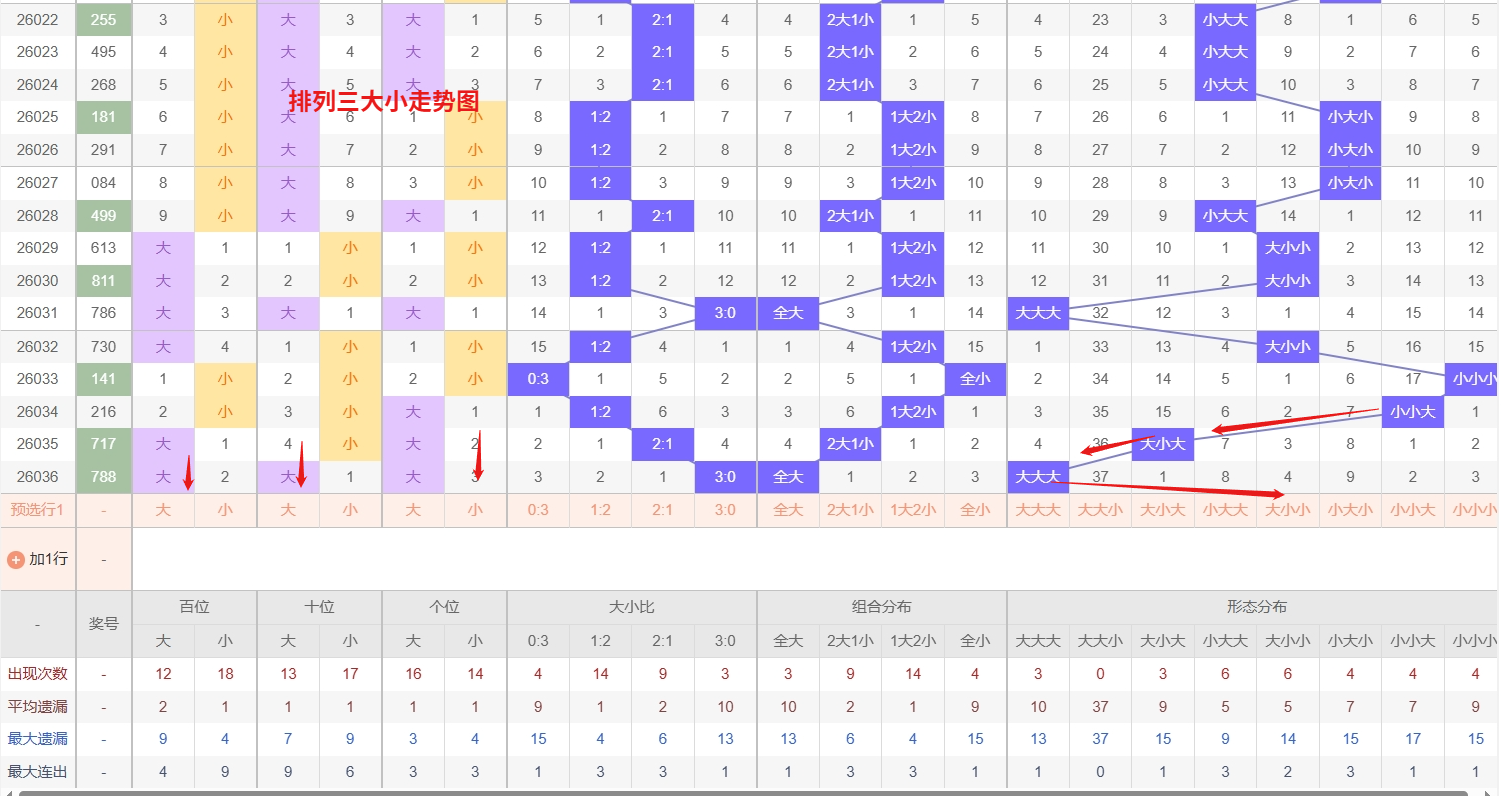 排列三 大小形态分析:从大小走势图上可以看出排列三100期内百位大小比约为46比54,十位大小比约为47:53,个位大小比约为52比48,除了个位奇数比偶数多,十位和百位偶数比奇数多。历史数据近2期开出大大大下一期的走势为,第314期开出大大大第315期开小小大。第327期开出大大大后第328期开大大小,第337期开出大大大后338期开小小小。近期排列三大小走势来看,大大小组合已沉寂多期,形成明显冷态,冷号在遗漏值积累过程中回补压力逐渐增大,尤其是在大小形态交替轮动的周期中,需关注其可能出现的反弹信号。而小小大组合近期表现活跃,呈现出持续热态,热组合往往具备一定的走势惯性,短期内仍有延续可能,需要重点防范。采取冷热兼顾的策略,在追踪小小大热号持续性的同时,对大大小冷号的回补机会保持警觉,所以排列三第2026037期大小形态推荐大大小防小小大。