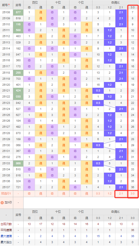上期奇偶比:2:1,近10期奇偶比出现情况:1:2、2:1、0:3、2:1、2:1、0:3、2:1、1:2、1:2、2:1,最近10期出现5期2:1,出现3期1:2,出现2期0:3,出现0期3:0,根据近10期出号规律本期看好奇数,推荐遗漏36期的3:0,防连出2:1,综上所述奇偶比推荐:防:2:1,重点关注:3:0。