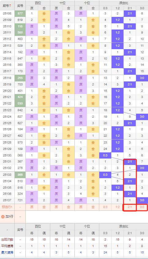上期质合比:3:0,近10期质合比出现情况:1:2、1:2、0:3、2:1、3:0、0:3、2:1、1:2、2:1、3:0,最近10期出现3期2:1,出现3期1:2,出现2期0:3,出现2期3:0,根据近10期规律本期看好质数,推荐隔期开出2:1,防连出3:0,综上所述质合比推荐:防:3:0,重点关注:2:1。