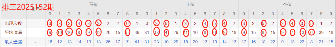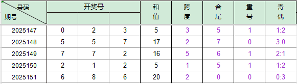 2025147期开奖号码023,我们可以看出近30期百位0出现3次,十位2出现6次(较151期减一),个位3出现2次(较149期减一)。