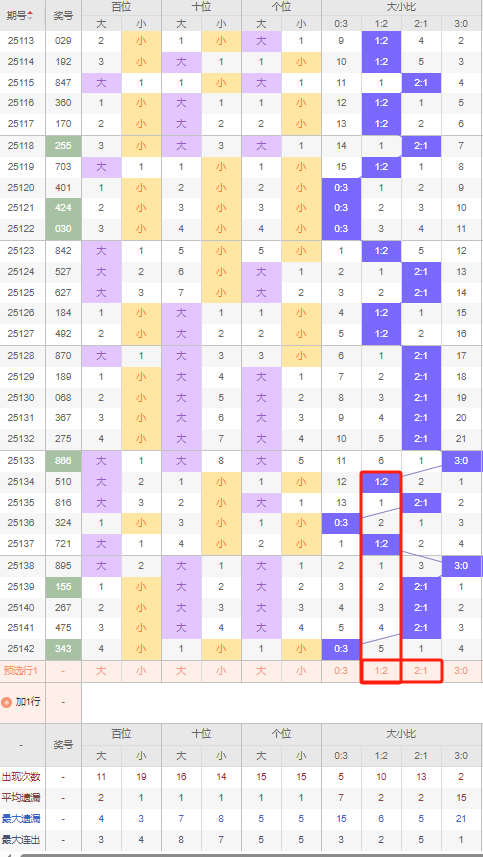 上期大小比:0:3,近10期大小比出现情况:3:0、1:2、2:1、0:3、1:2、3:0、2:1、2:1、2:1、0:3,最近10期出4期2:1,出现2期1:2,出现2期0:3,出现2期3:0,根据近10期出号规律本期看好大号,推荐隔期开出2:1,防遗漏5期的1:2,综上所述大小比推荐:防:1:2,重点关注:2:1。