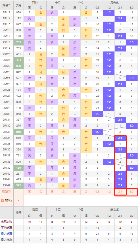 上期质合比:2:1,近10期质合比出现情况:0:3、2:1、1:2、2:1、3:0、1:2、3:0、2:1、2:1、2:1,最近10期出现5期2:1,出现2期1:2,出现1期0:3,出现2期3:0,根据近10期规律本期看好质数,推荐四连出2:1,防遗漏3期的3:0,综上所述质合比推荐:防:3:0,重点关注:2:1。
