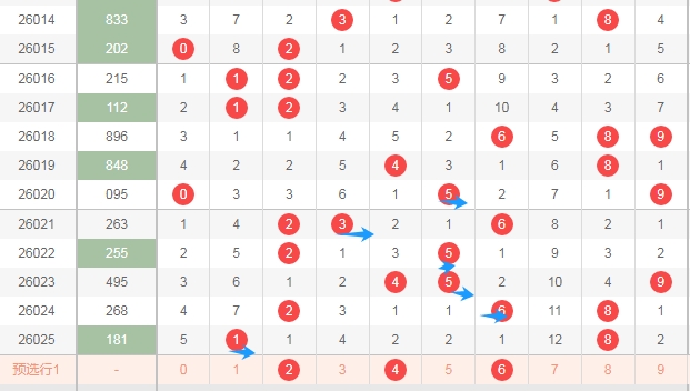 上图是体彩排列三开奖号码分布走势图,我在上面走势图中标注出来的蓝色小箭头表示的就是中间那个数字,最近中间那个数字开出的奇数多,开出的偶数少,那么本期如果看中间那个数字是偶数的话,那么上面标注出来的数字024至少要出1个吧。