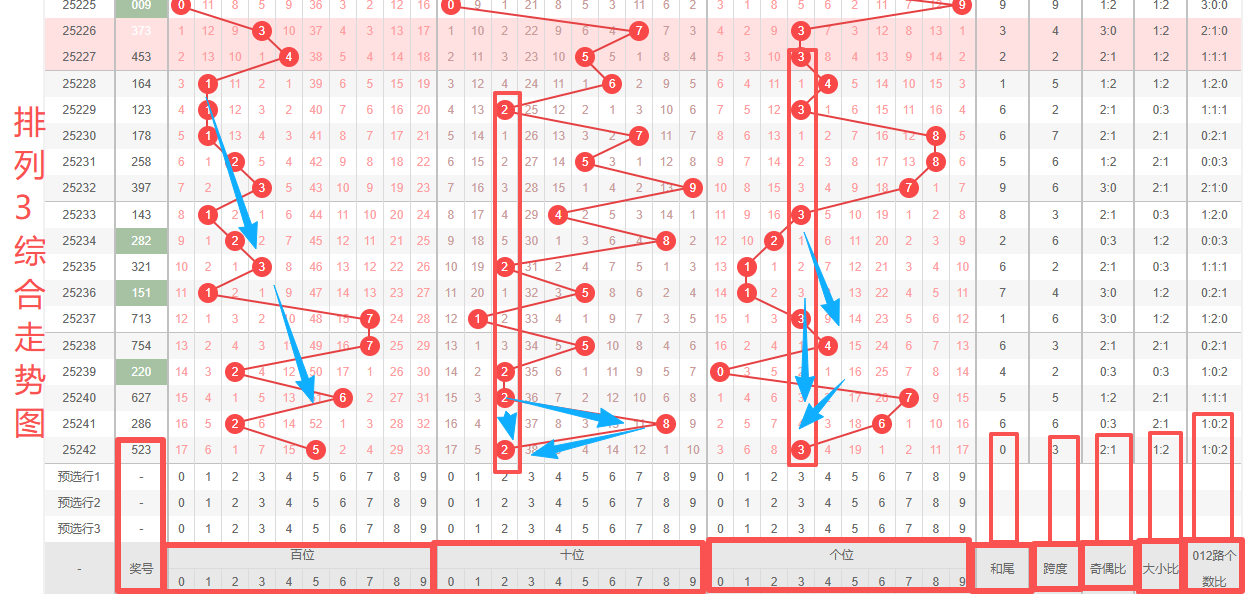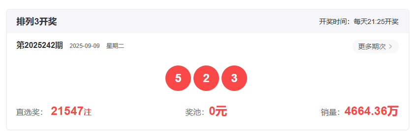体彩排列3第2025242开奖号码523,形态为组六,奇偶比21,和值10,跨度3,大小比12,【012】路个数比1:0:2。
