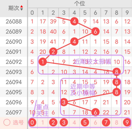 近7期(091~097)开奖号个位号码球分别为2、1、8、8、8、3、6,开奖号与上一期走出的振幅分别为2、1、7、0、0、5、3。091期走出2号小数号码球,走出“2”的小幅度,092期走出1号小数号码球,走出“1”的小幅度,093期走出8号大数号码球,走出“7”的大幅度,094期走出8号大数号码球,走出“0”的小幅度,095期走出8号大数号码球,走出“0”的小幅度,096期走出3号中小数号码球,走出“5”的中大幅度,097期走出6号中大数号码球,走出“3”的中小幅度;从近期振幅大小的走势及大小走势来看,中大振幅走在4~6之间较为适宜,中小振幅走在1~3之间较为适宜;结合走势图的整体及大小走势分析,本期个位应重点关注号码球为0、2、3、5、7、9。