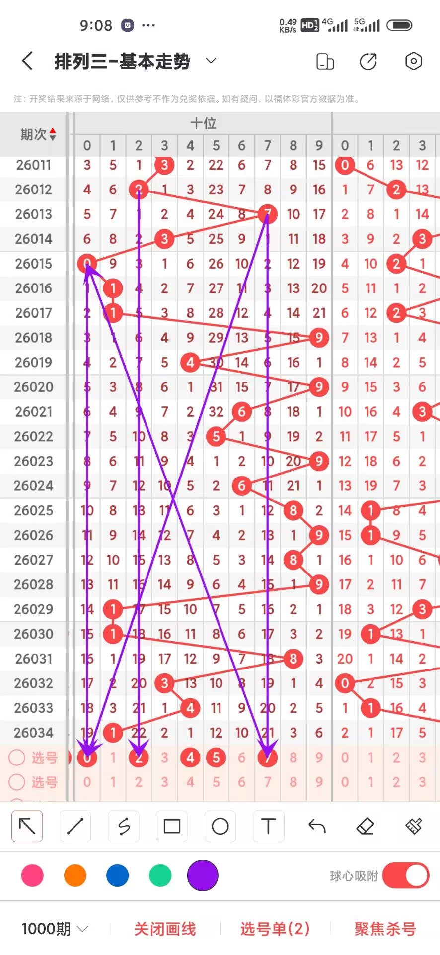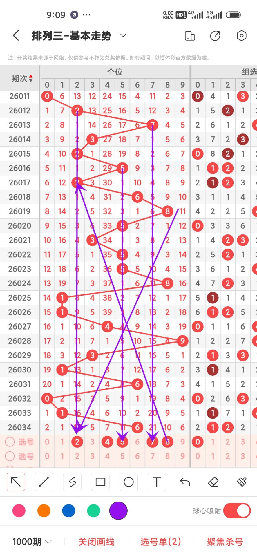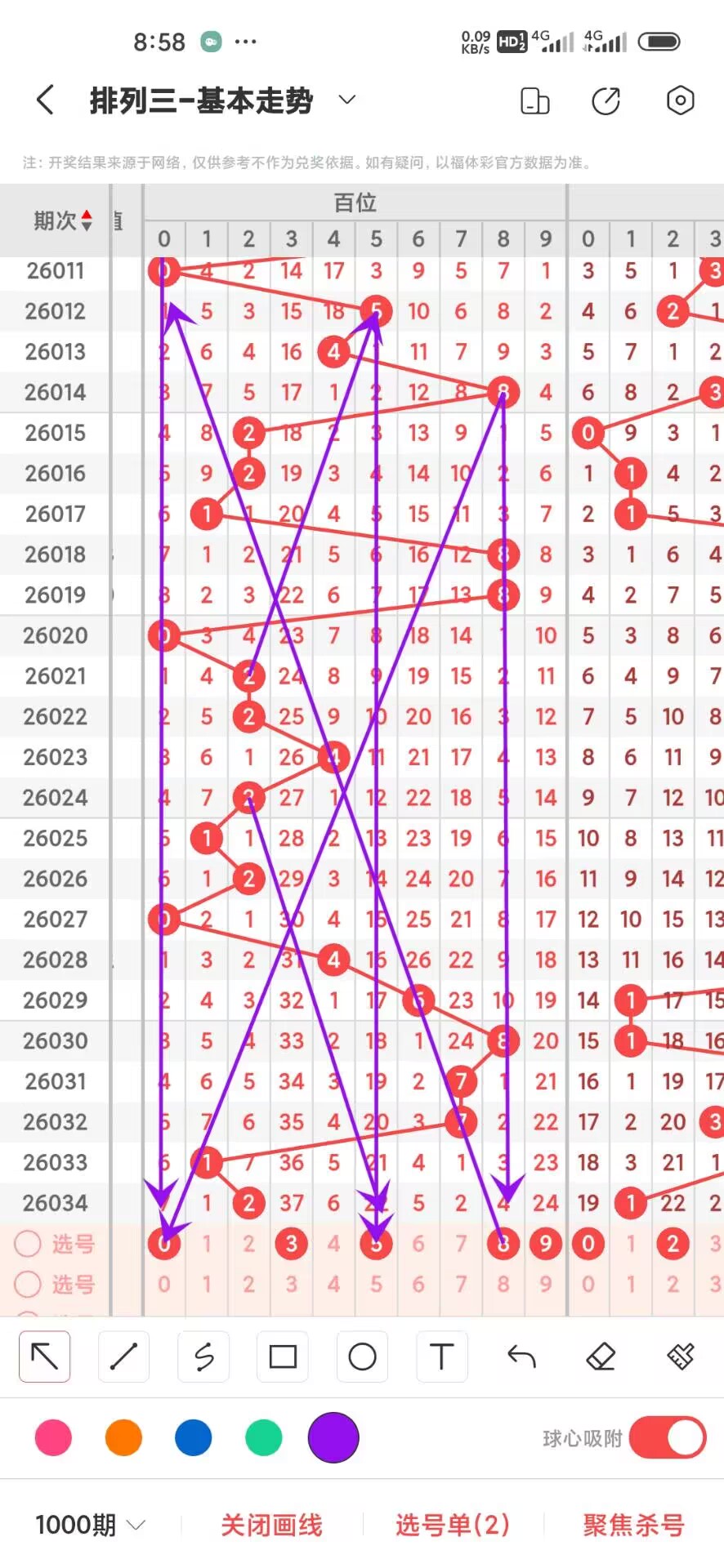 2026035期,上期十位开出奇数1,我们通过走势图来看1000期012路中下号的数据,0路号码的最大总数是374次,0369分别在1000期内下号分别是94,103,74,103,这几个数之间6目前下号最少,我们再来看1路号码最大总数是319,147号码分别是,105,106,108,这三者之间差别不大,再回过头来看2路号最大总数是317次,258号码分别是109,86,112次,这三个数之间5下号最少,在来看十位平均遗漏,目前0路遗漏的总数是41次,1路遗漏的总数是25,2路遗漏总数27,十位目前小号热度比较高,我们可以关注下,通过上面的走势分析我们可以看出目前十位13468号码走势比较好,0257号码走势就有点冷淡,今天十位我们重点关注02457,具体看下面走势图