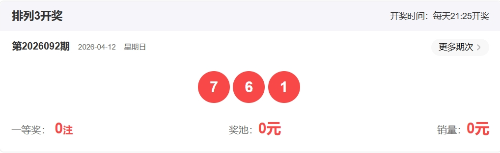 排列三第2026092期开奖回顾:开奖号码:761   形态:组六