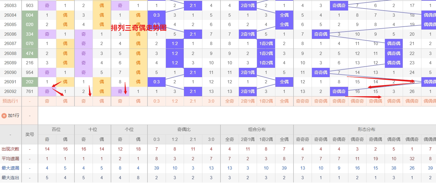 排列三 奇偶分析:从上图可以看出排列三100期内百位奇偶比约为46比54,十位奇偶比为53比47,个位奇偶比为52比48,十位的比值比较均衡,但是百位的比值偏差就有点大,历史奇偶形态近2期开出奇偶奇后下一期的走势为,第002期开出奇偶奇后003期开奇偶偶, 第017期开出奇偶奇后第018期开偶偶奇,第034期开出奇偶奇后第035期开奇奇奇,排列三近期奇偶走势中,奇偶偶与偶偶奇这两种组合形态已经长期未现身,成为当前最典型的冷态组合。随着遗漏值的不断累积,这两种形态所积蓄的反弹动能也越发强烈,技术性回补的需求日益凸显。从概率平衡的角度来看,任何长期缺失的组合都会在统计回归的作用下迎来修复窗口,奇偶偶和偶偶奇自然也不例外。将奇偶偶和偶偶奇作为重点防守方向,给予足够的关注和防范,不要因为它们长期未出就彻底忽视 ,所以排列三2026093期奇偶形态推偶偶与偶偶奇。