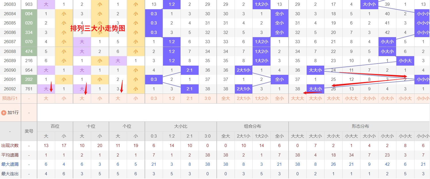 排列三 大小形态分析:从大小走势图上可以看出排列三100期内百位大小比约为55比45,十位大小比约为46:54,个位大小比约为52比48,除了个位和百位奇数比偶数多,十位偶数比奇数多。历史数据近2期开出大大小下一期的走势为,第007期开大大小后第008期开小大大。第012期开出大大小后第013期开大小大,第035期开出大大小后036期开大大大。排列三近期大小走势中,小大大与大大大这两种组合形态已经持续多期未开出,冷态特征十分明显。随着遗漏值的不断累积,这两种形态所积聚的反弹动能也在同步增强,从概率回归的基本逻辑来看,长期缺失的组合往往会在某个节点迎来集中回补。进一步观察近期热态组合的表现,诸如小小大、大小小等形态频繁现身,已经在很大程度上消耗了热号的延续空间,这反而为冷态组合的反弹提供了有利时机。所以排列三第2026093期大小形态推荐小大大大大大