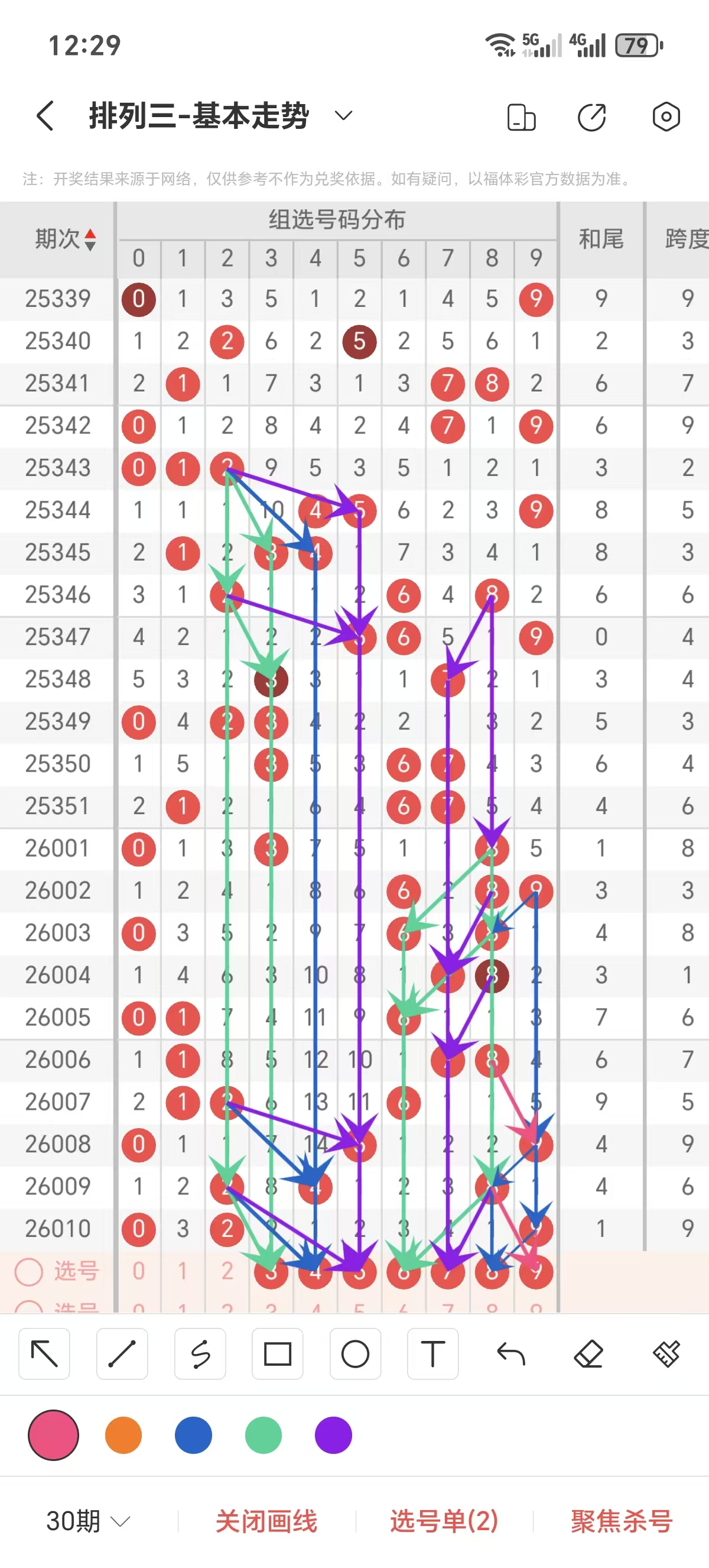 通常情况下在五期之内重复一个跨度的概率较高,近五期重复了9的跨度,近五期跨度为7/5/9/6/9,近期0路的跨度较热,本期要侧重4/5跨为主的号码组合。选择好跨度就可以从跨度方面选择相应的双胆码组合,双胆码的选取要根据近期和历史的走势进一步的分析选取。