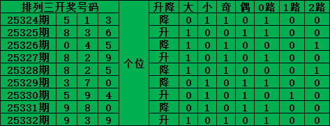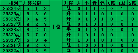 012路比:4:0:5,9期中最热的是2路,本期选择1路/0路:0/4号。