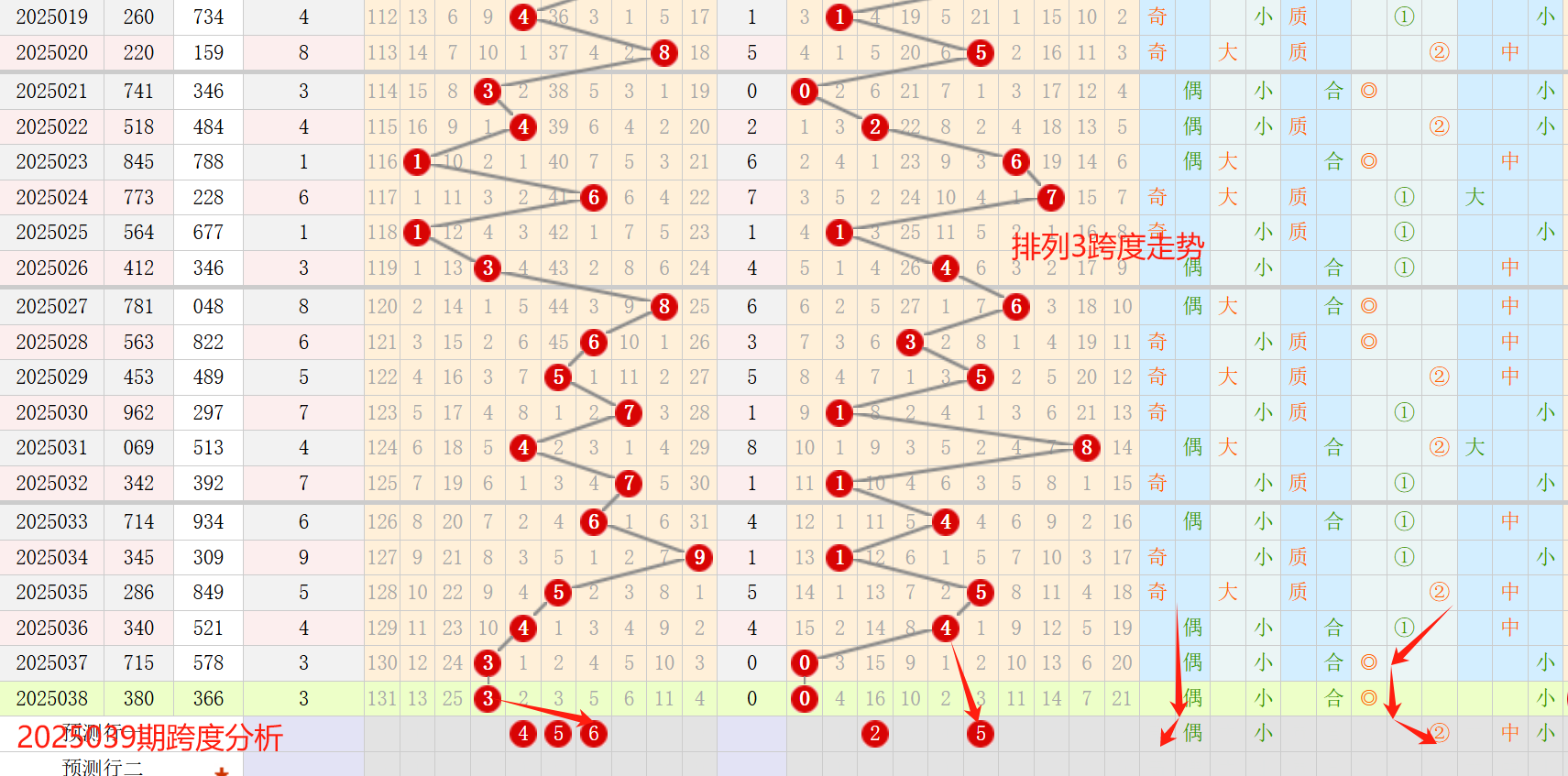 上期跨度开出3跨,本期落点是中等跨度,参考跨度4、5、6,看好4/6跨,根据趋势发展,本期开出6跨的问题不大;