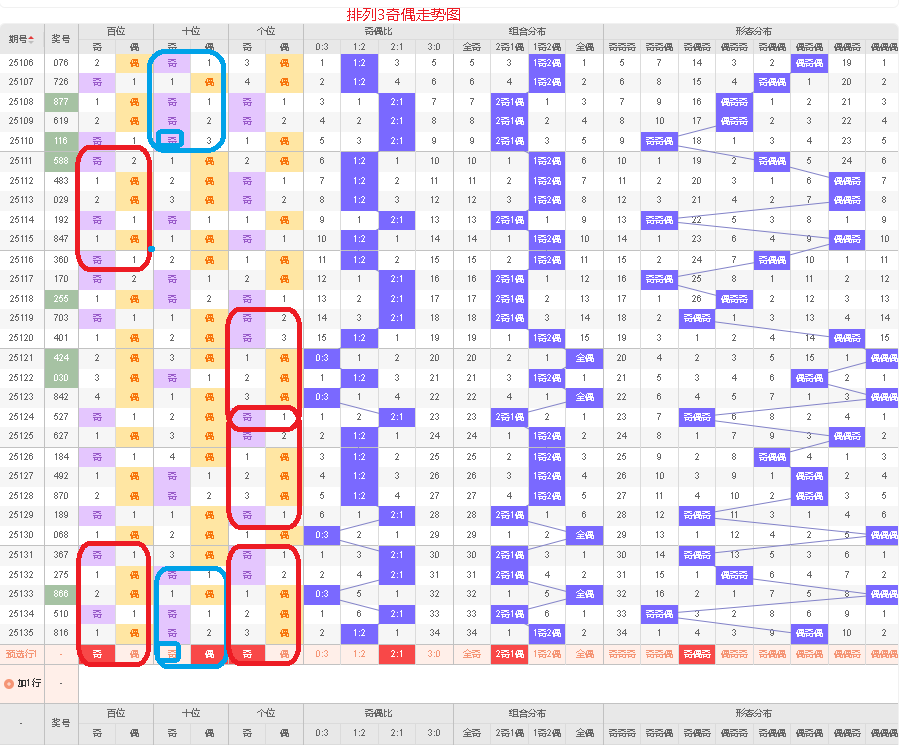 上一期的奇偶比为1:2,两偶的号码组合,从近五期的奇偶数出现情况看,奇数出现7次,偶数出现8次,奇数偶数号码出现较平均,本期要侧重两奇的号码组合,侧重奇偶奇或奇奇奇的号码组合,根据奇偶组合形态可做五码定位13579/02468/13579或13579/13579/13579