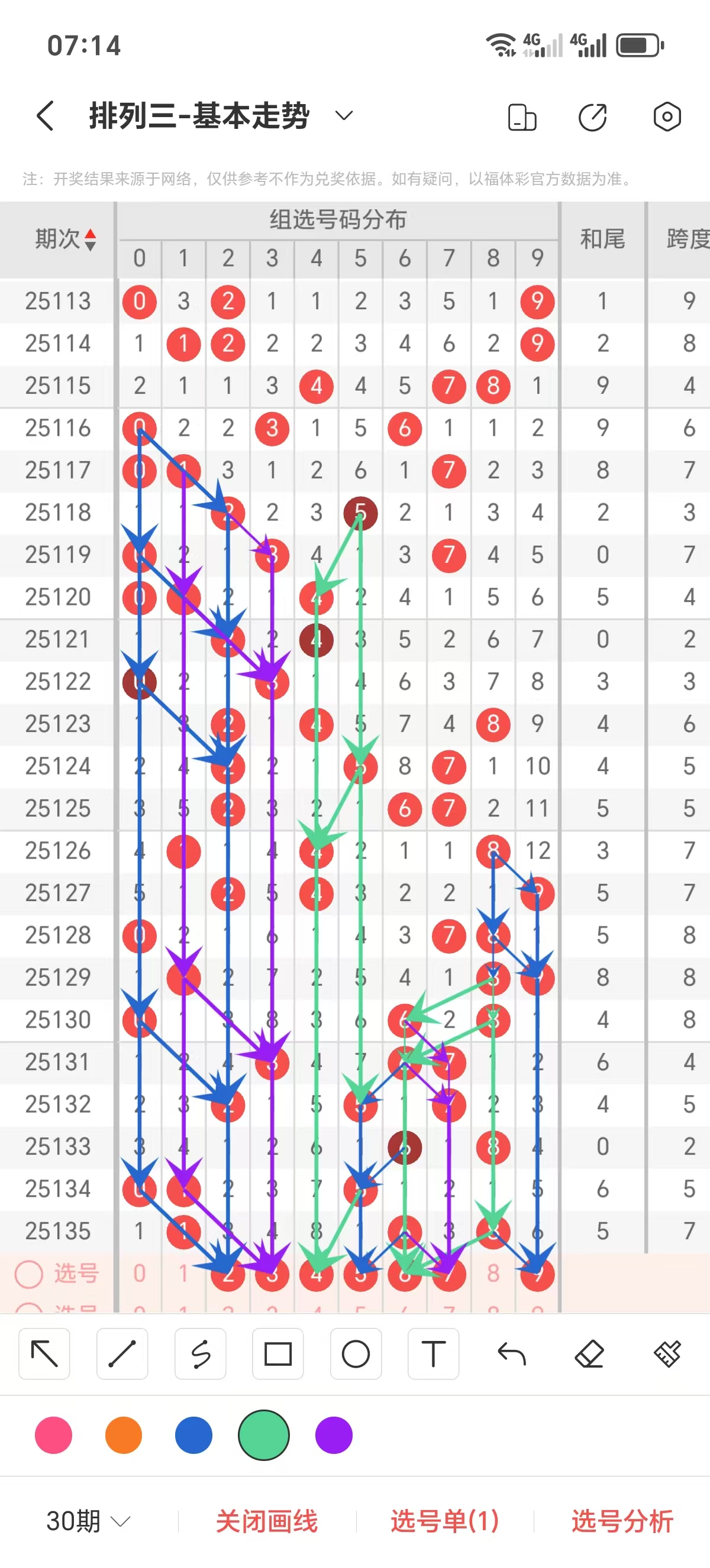 跨度通常情况下在五期之内重复一个跨度的概率较高,近五期重复了5的跨度,近五期跨度为4/5/2/5/7,近期12路的跨度较热,本期要侧重3/4/6跨为主的号码组合。选择好跨度就可以从跨度方面选择相应的双胆码组合,双胆码的选取要根据近期和历史的走势进一步的分析选取。