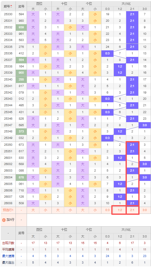 上期大小比:2:1,近10期大小比出现情况:2:1、2:1、1:2、3:0、2:1、3:0、1:2、2:1、1:2、2:1,最近10期出5期2:1,出现3期1:2,出现0期0:3,出现2期3:0,根据近10期出号规律本期推荐隔期出1:2,防连出2:1,综上所述大小比推荐:防:2:1,重点关注:1:2。