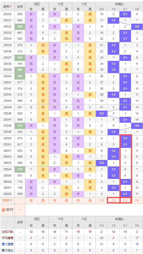 上期奇偶比:2:1,近10期奇偶比出现情况:2:1、2:1、1:2、1:2、0:3、1:2、1:2、2:1、1:2、2:1,最近10期出现4期2:1,出现5期1:2,出现1期0:3,出现0期3:0,根据近10期出号规律本期推荐连出2:1,防隔期出1:2,综上所述奇偶比推荐:防:1:2,重点关注:2:1。