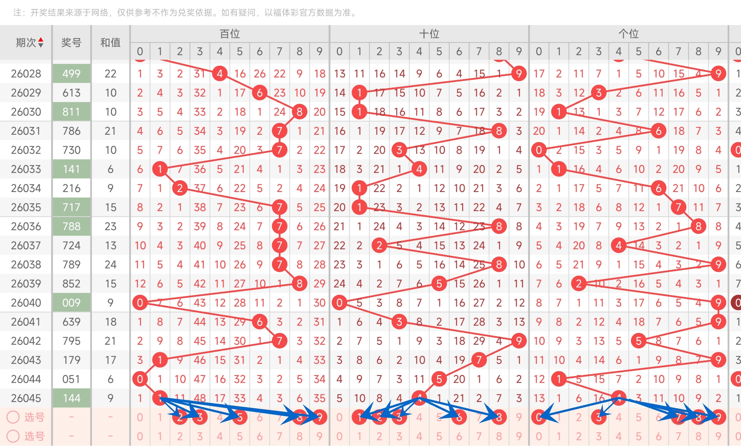 上期和值为9,往前一期和值为6,趋势往右移动,偏移量为3。通过走势图分析,9和值是近30期内开出很小的和值,下降空间很小,上升空间很大,本期比较看好和值变大。因此推测本期趋势是往右的,和值会变大,小概率往左,和值变小。