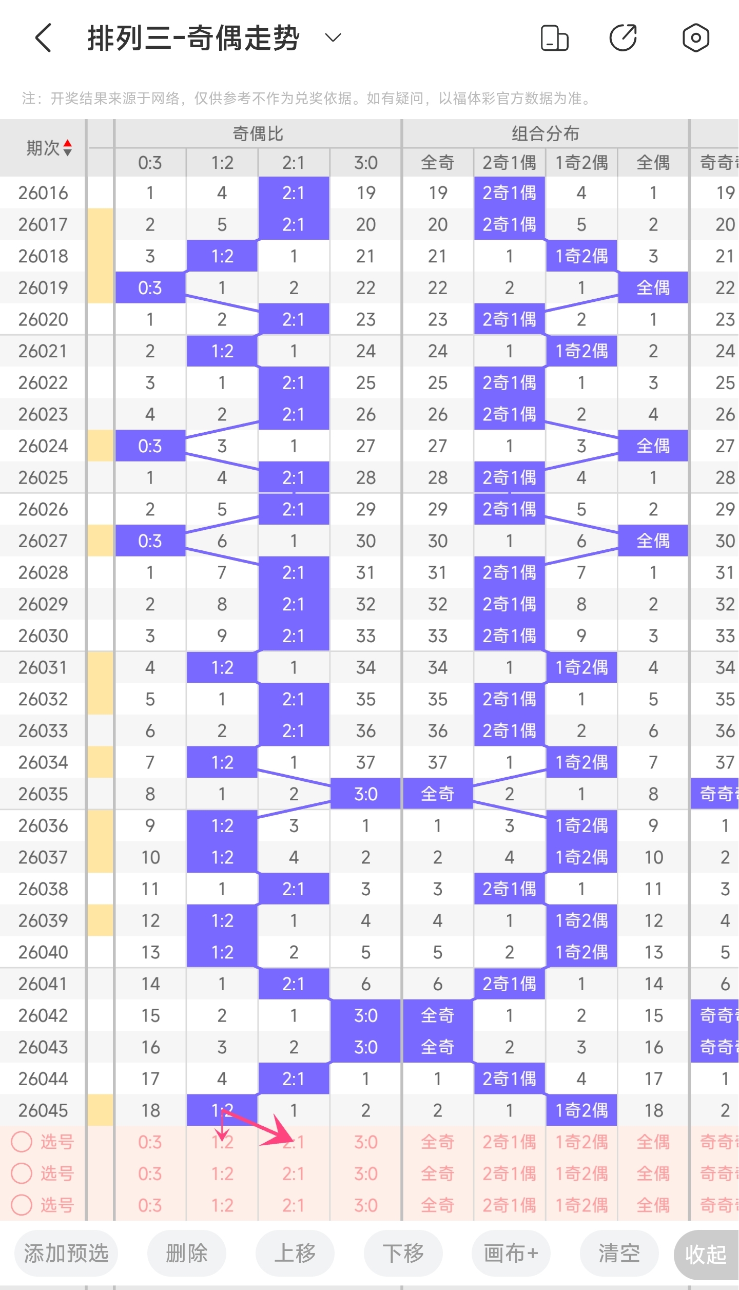 上期开出了1:2的奇偶比。往前一期是2:1奇偶比。通过分析奇偶走势图,近30期内开出1:2奇偶比的次数是9次,开出2:1奇偶比的次数是15次,3:0是3次,0:3是3次。和前一期相比,1:2次数变多,0:3次数变少。通过走势图分析,上期开2:1奇偶比,本期看好1:2奇偶比。所以推测本期可能开1:2奇偶比,其次是2:1奇偶比,最后是3:0或者0:3奇偶比。