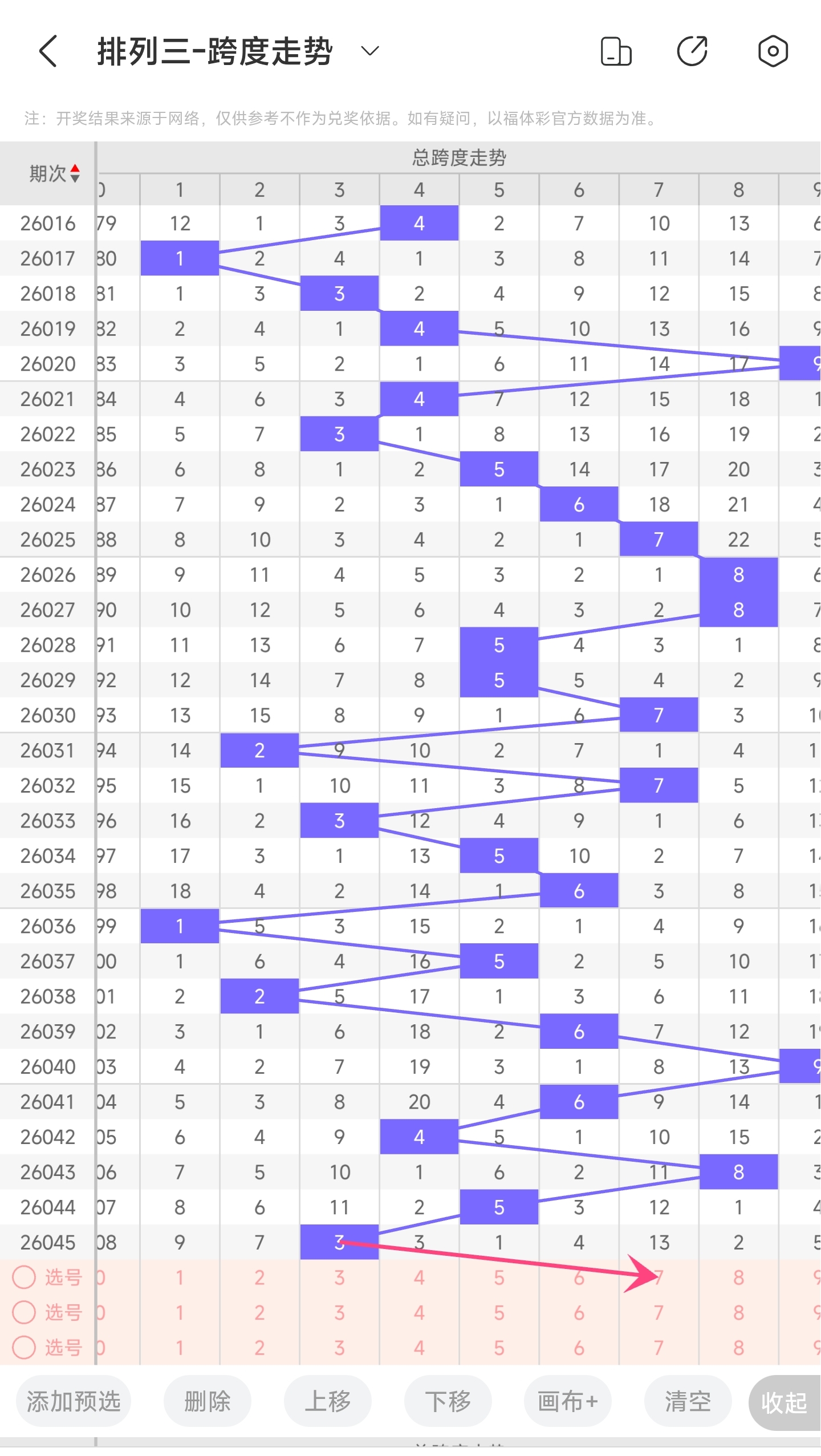 上期跨度为3,往前一期跨度是5,趋势往左移动,偏移量为2。跨度值3时,跨度值是近30期开出比较小的值。通过走势图分析,目前的趋势是大概率往右,小概率往左。所以推测本期跨度可能为25678等跨度。