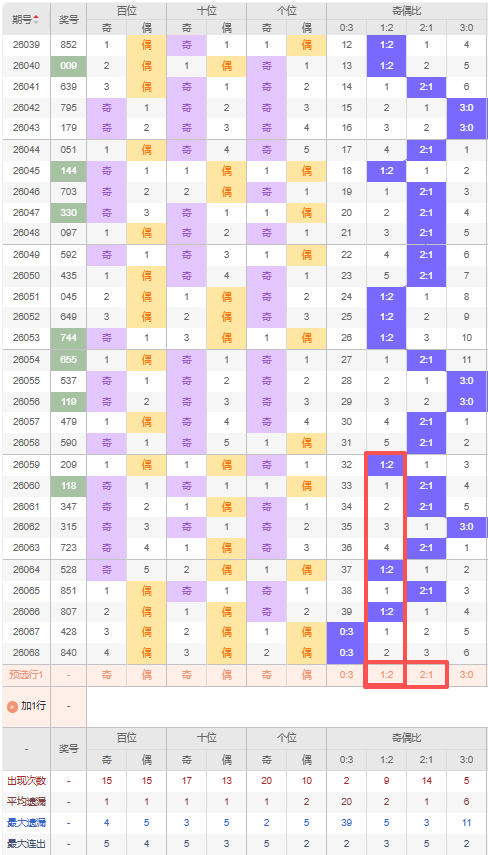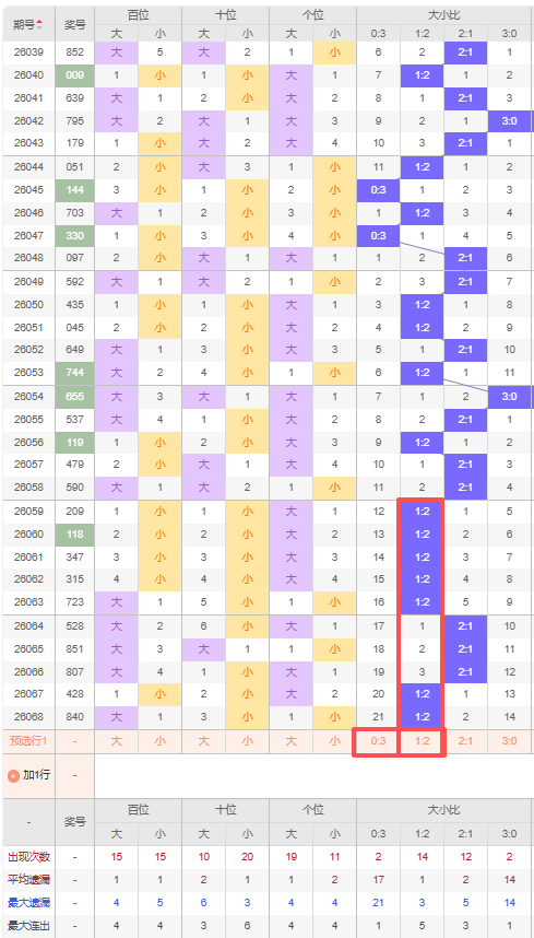 上期大小比:1:2,近10期大小比出现情况:1:2、1:2、1:2、1:2、1:2、2:1、2:1、2:1、1:2、1:2,最近10期出3期2:1,出现7期1:2,出现0期0:3,出现0期3:0,根据近10期出号规律本期推荐遗漏21期的0:3,防三连出1:2,综上所述大小比推荐:防:1:2,重点关注:0:3。