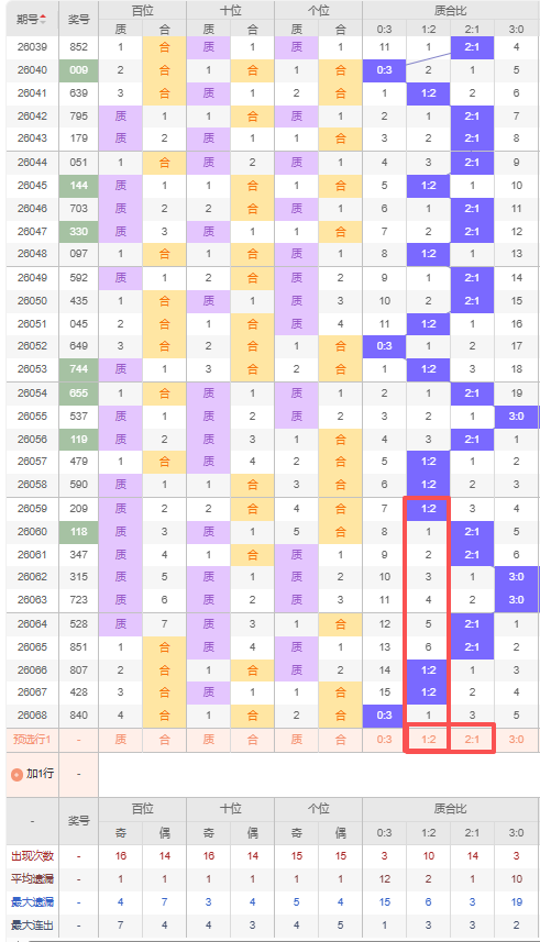 上期质合比:0:3,近10期质合比出现情况:1:2、2:1、2:1、3:0、3:0、2:1、2:1、1:2、1:2、0:3,最近10期出现4期2:1,出现3期1:2,出现1期0:3,出现2期3:0,根据近10期规律本期推荐遗漏3期出2:1,防遗漏2期出1:2,综上所述质合比推荐:防:1:2,重点关注:2:1。