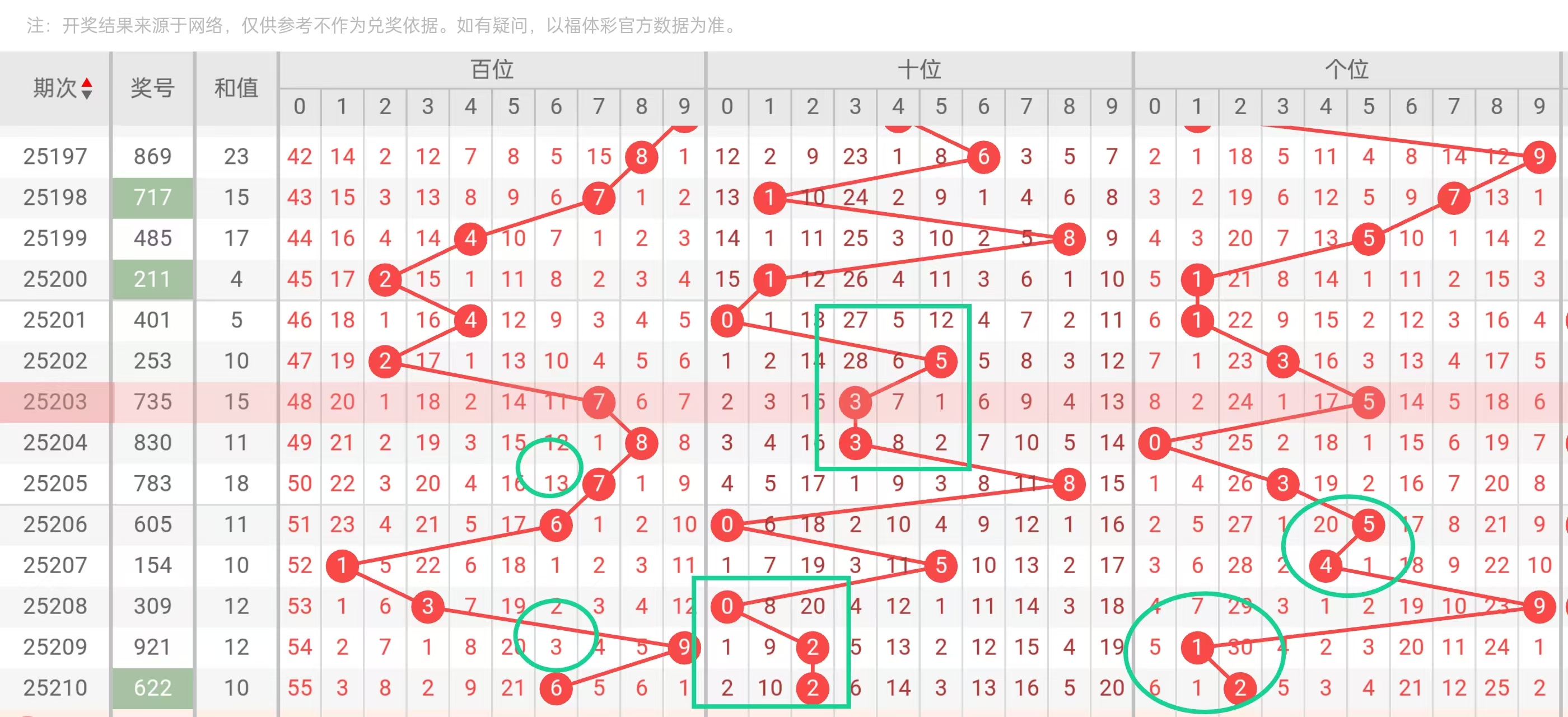 众数是出现频率最高的数字(可能多个),反映高频“热号”;中位数是将序列排序后取中间值(偶数期时取第15和16位的平均值),反映分布中心。以下分别计算百位、十位和个位的统计值。