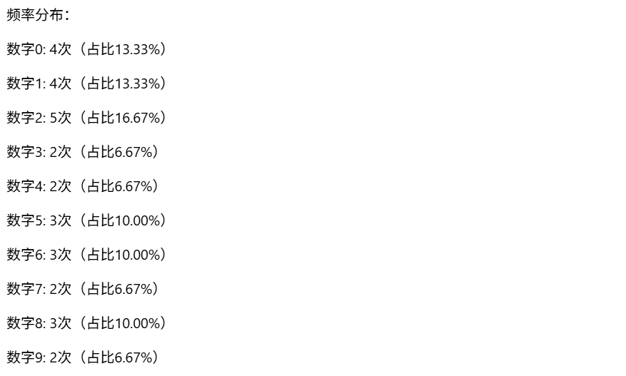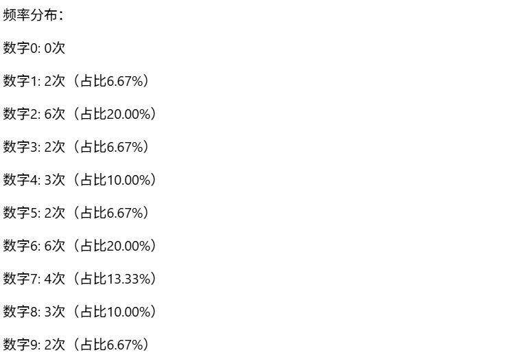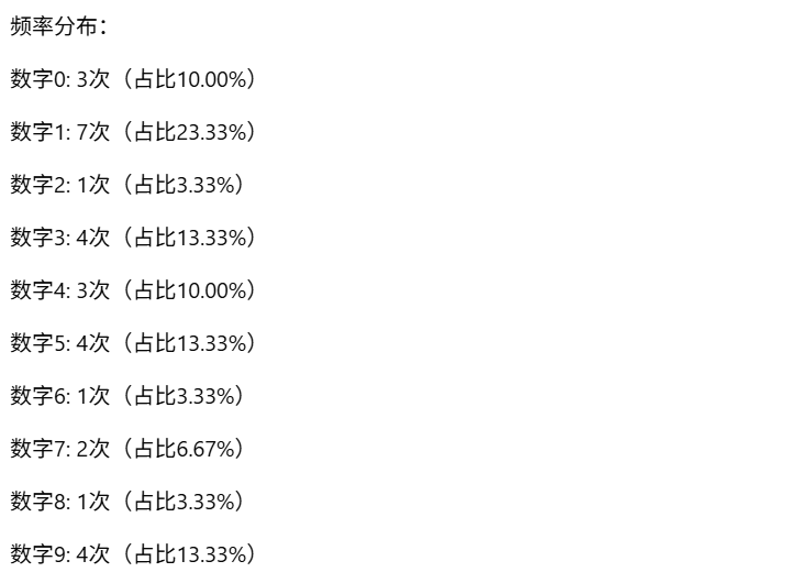 众数:数字1(出现7次,频率最高,占比超23%)。